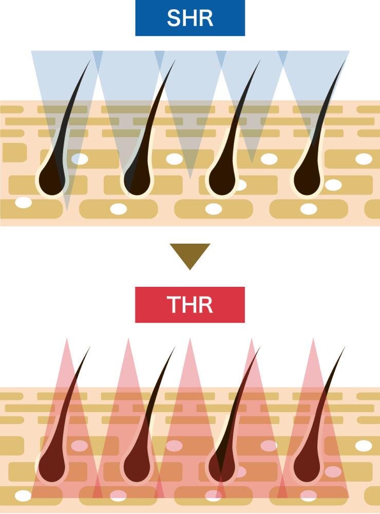 色素だけに頼った従来の光とは異なり、THRモードは効果が出にくかった産毛にも効果を発揮します。さらに、サーモヒート効果で脱毛しながら肌のキメを整えます。
